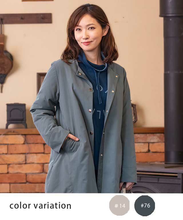 コートを羽織った時のモコモコ感がなく、着ぶくれしにくいのが特徴。また、ドット釦で簡単に前を留められます♪