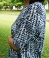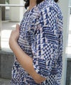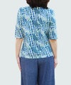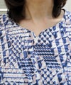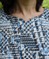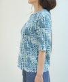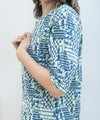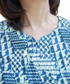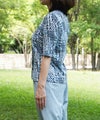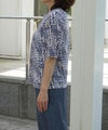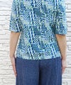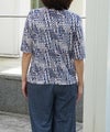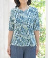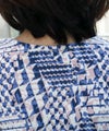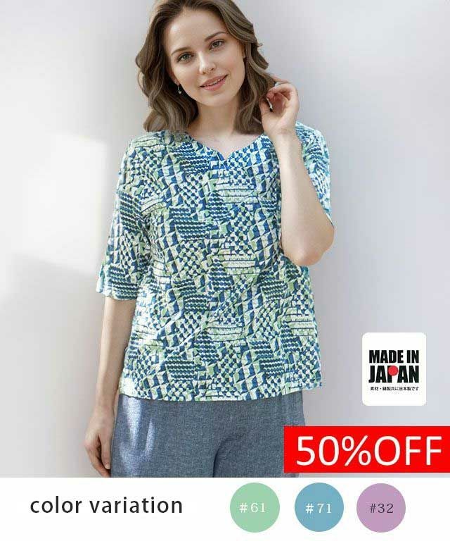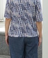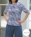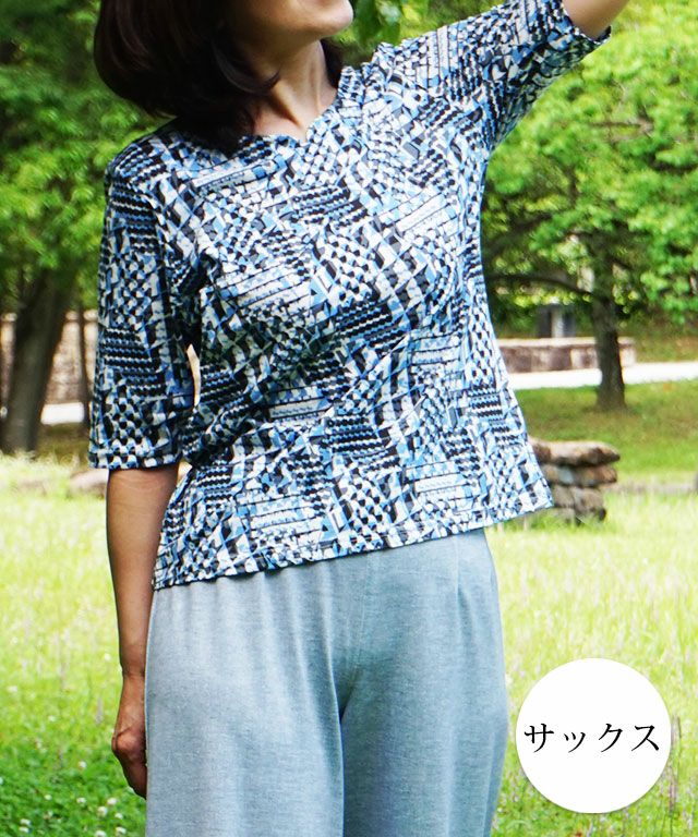 綿100%天竺素材に幾何柄プリントを施したプリントカットソーです。ストレッチ性に優れている天竺はさらりと触り心地も◎