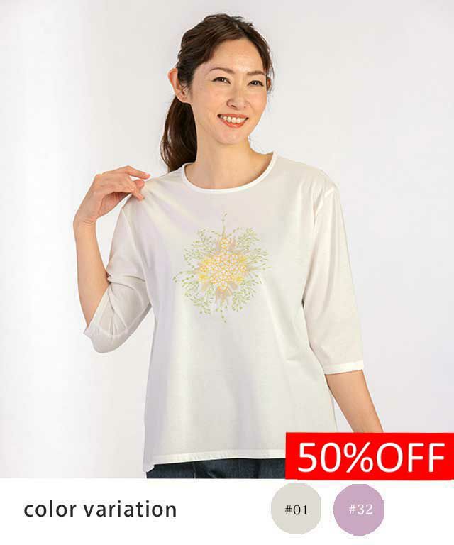 前身に刺しゅうXスパンコール使いの加工モチーフをほどこした、丸衿カットソー。