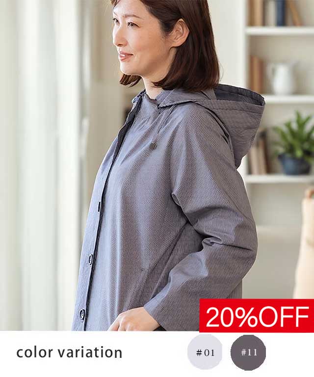 フード付きはカジュアルに、外せばすっきりとした大人の装いに。
