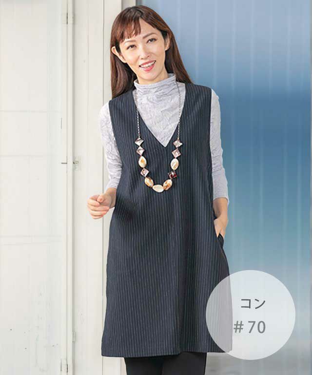 細ストライプが上品でスマートな印象のあるジャンパースカートベスト。