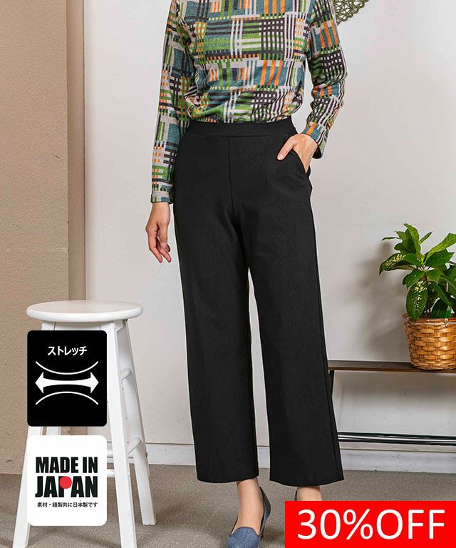 360度ストレッチ、ウエスト周りも総ゴム仕様、シンプルで穿き心地の良いパンツです。セミワイドシルエットで、美脚効果が高く、合わせるトップスを選ばない優秀アイテム!