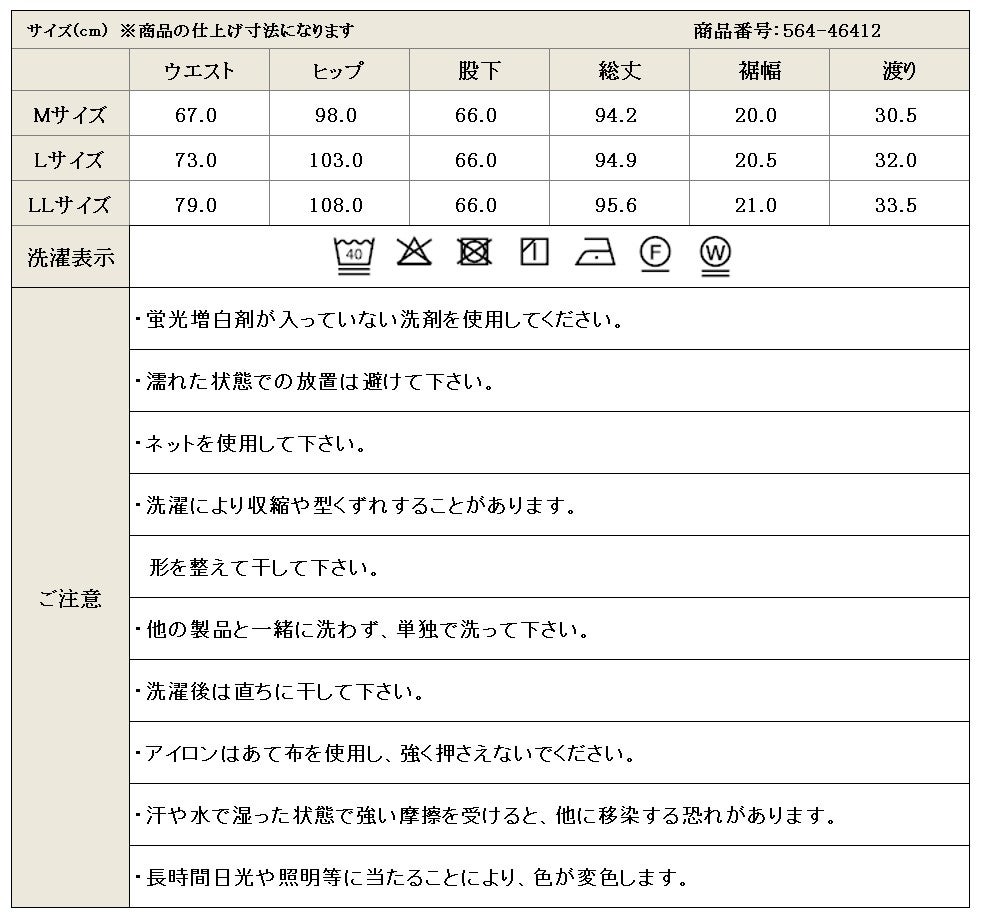 同じ素材を使った**羽織りジャケット(NO.564-56414)**と合わせれば、上下セットアップ風のコーディネートに。おでかけにも、おうちでのリラックスタイムにも、毎日活躍してくれる一本です。