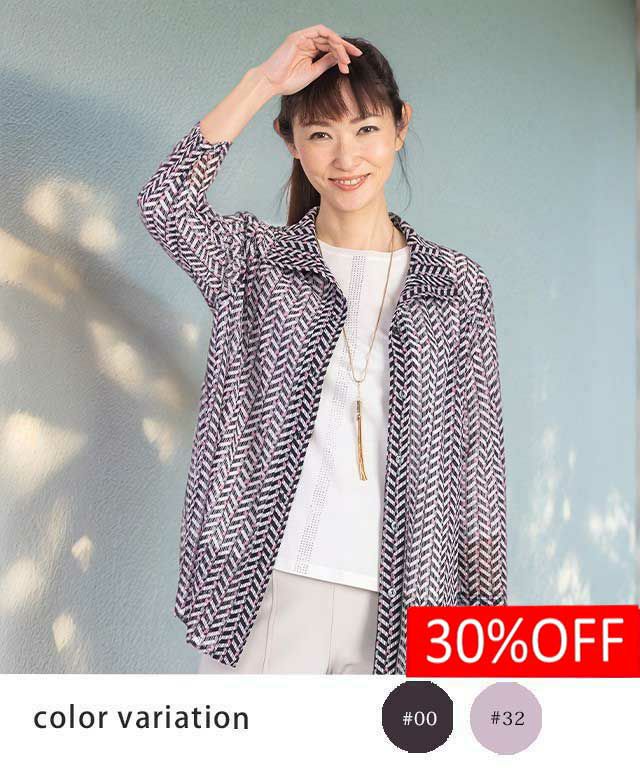 コードパワーネットにヘリンボーン柄プリントを施した、軽さのあるブラウス。