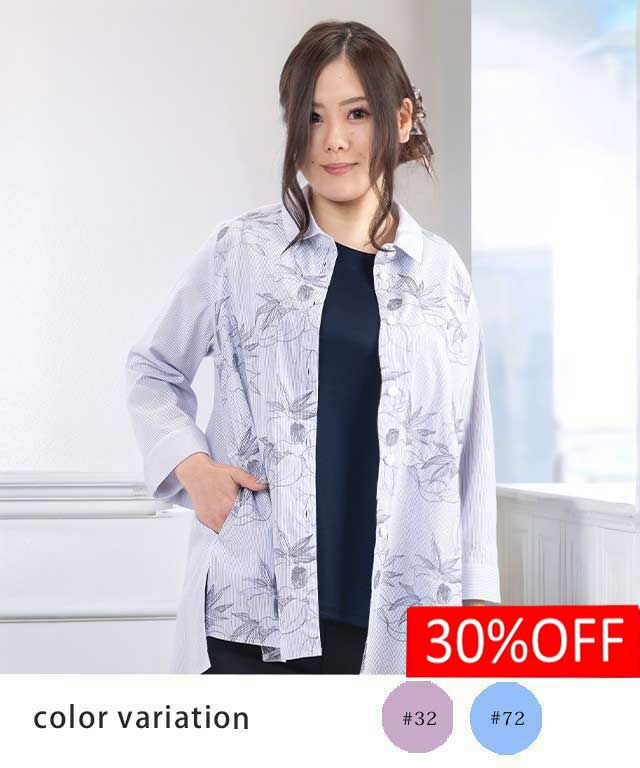 細いストライプ柄の素材に花柄の刺繍を施したブラウス。