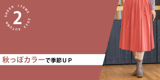一点投入でシーズンムードが加速する、秋カラーアイテム。パワフルなレッドはスカートで